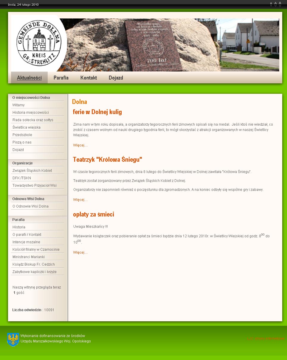 Od ubiegłego roku swoją wirtualną wizytówkę posiada kolejna, wyjątkowa miejscowość w naszej gminie – Dolna. Pod adresem www.dolna.com.pl jest do dyspozycji każdej osoby mającej dostęp do sieci – oficjalna strona miejscowości licząca niecałe 400. mieszkańców.