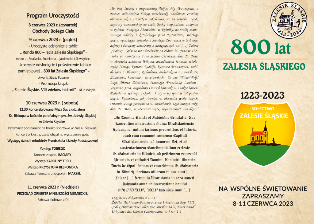 Już teraz można zobaczyć w wersji elektronicznej ulotkę dotyczącą 800-lecia Zalesia Śląskiego. W najbliższym czasie członkowie Rady Sołeckiej naszej miejscowości, dotrą także do każdego domu w naszej miejscowości i dostarczą także taką ulotkę w formie papierowej.